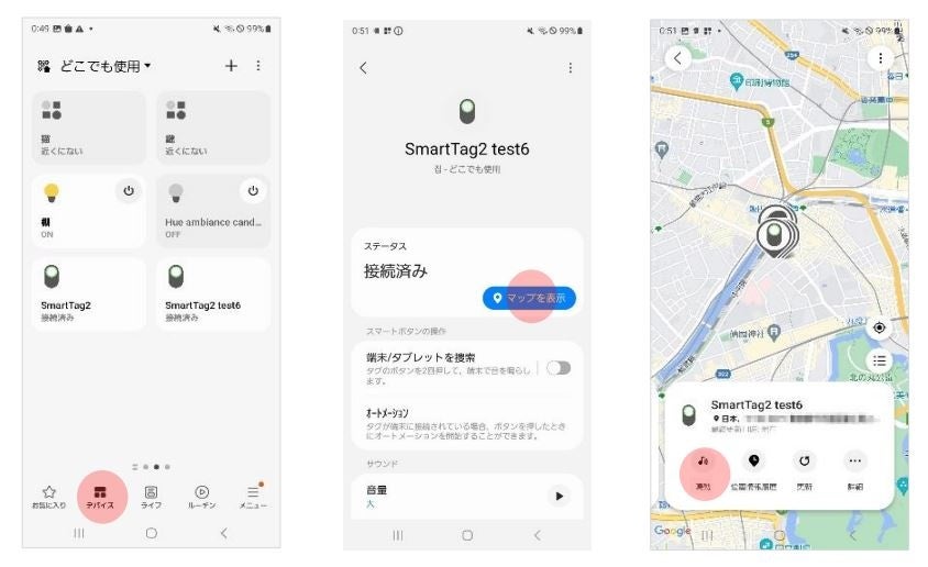 ②「Galaxy SmartTag2」を選択 >「マップを表示」を選択 >「詳細」を選択