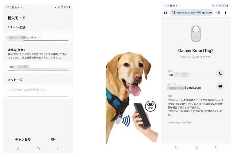 「Galaxy SmartTag2」は、初代には非搭載だったNFC技術(近距離無線通信)が搭載され、紛失物がより探しやすくなりました。紛失モードが有効化されている場合、持ち主が事前に連絡先やメッセージをSmartTagに入力・記憶した情報を、発見者のスマートフォンのOSを問わず表示できます。例えば、「Galaxy SmartTag2」を付けたペットや貴重品などを第三者が発見した場合、NFC対応のスマートフォンでスキャンするだけで本来の所有者の連絡先やメッセージを確認することができるため、すぐに持ち主とコンタクトを取ることができます。