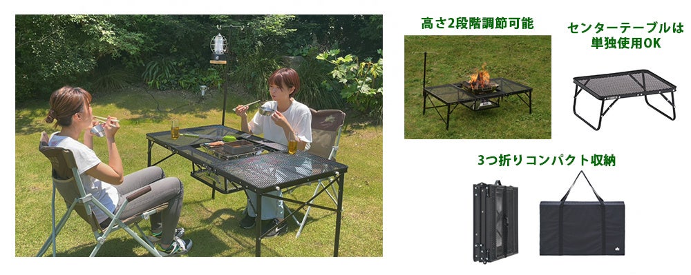 天板中央のセンターテーブルは着脱式になており、裏返してセットすると、テーブル上に「ピラミッドTAKIBI」や「グリルアタッシュM」などのグリルやたき火台をセットできる2WAY仕様で、チェアに座ったままテーブルを囲んでBBQを楽しめます。また、メインテーブルの高さは2段階で調節できて、ローポジションでは囲炉裏スタイルでたき火を楽しむこともできます。