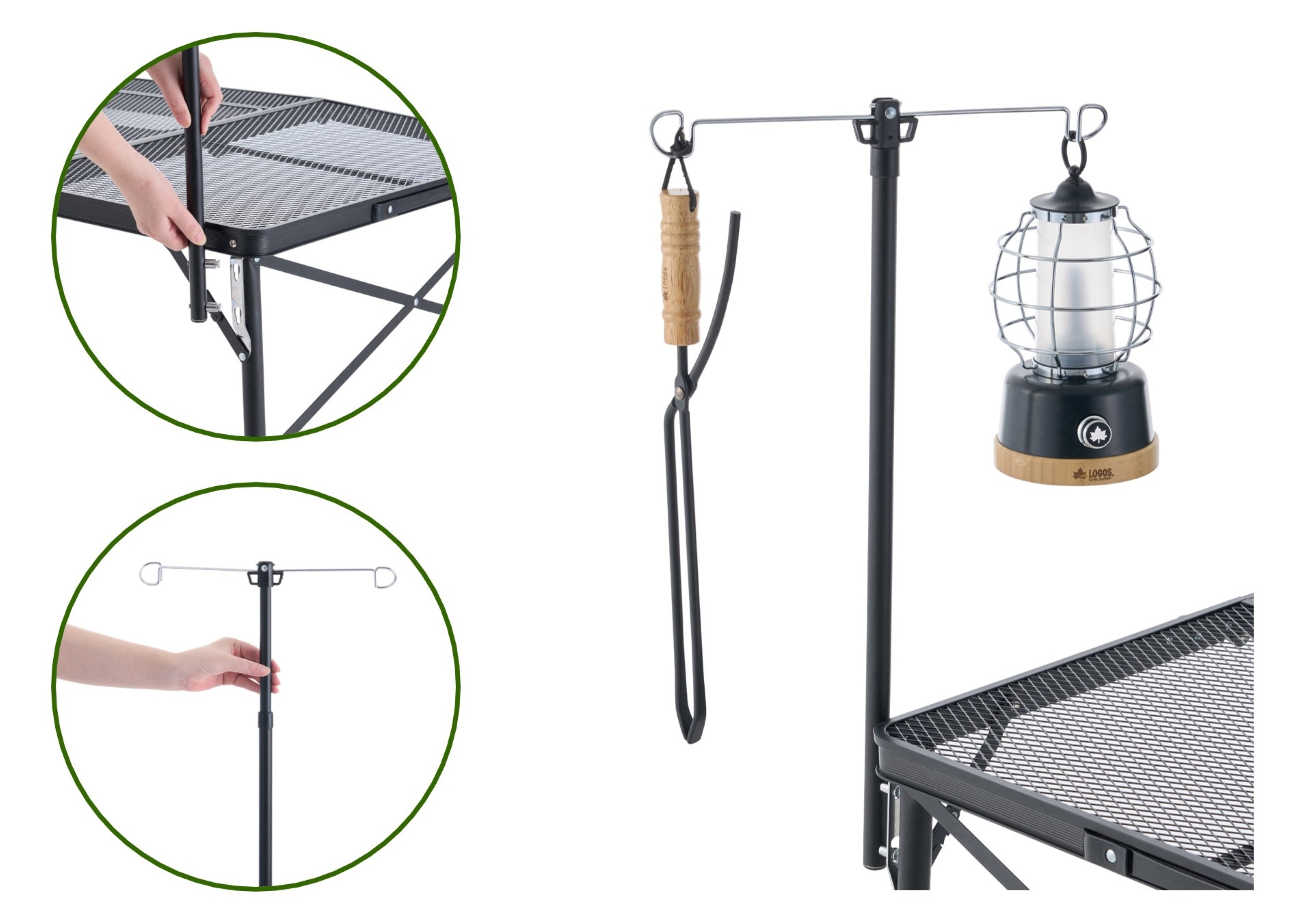 取り付け簡単なランタンポール付き。高さ調節できるのでお好みの高さからテーブルを照らすことができて夜も安心。また、T字フックなので左右に吊り下げ可能で、調理ツールの置き場としても最適。