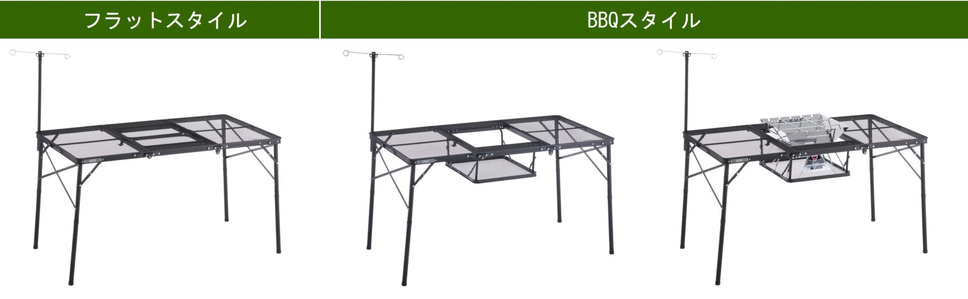テーブルは放熱性に優れた丈夫なスチールメッシュ天板なので、フライパンやダッチオーブンをそのまま置いておくことも可能で、調理時に便利です。また、センターテーブルは単独でサイドテーブルとして使うこともできます。
