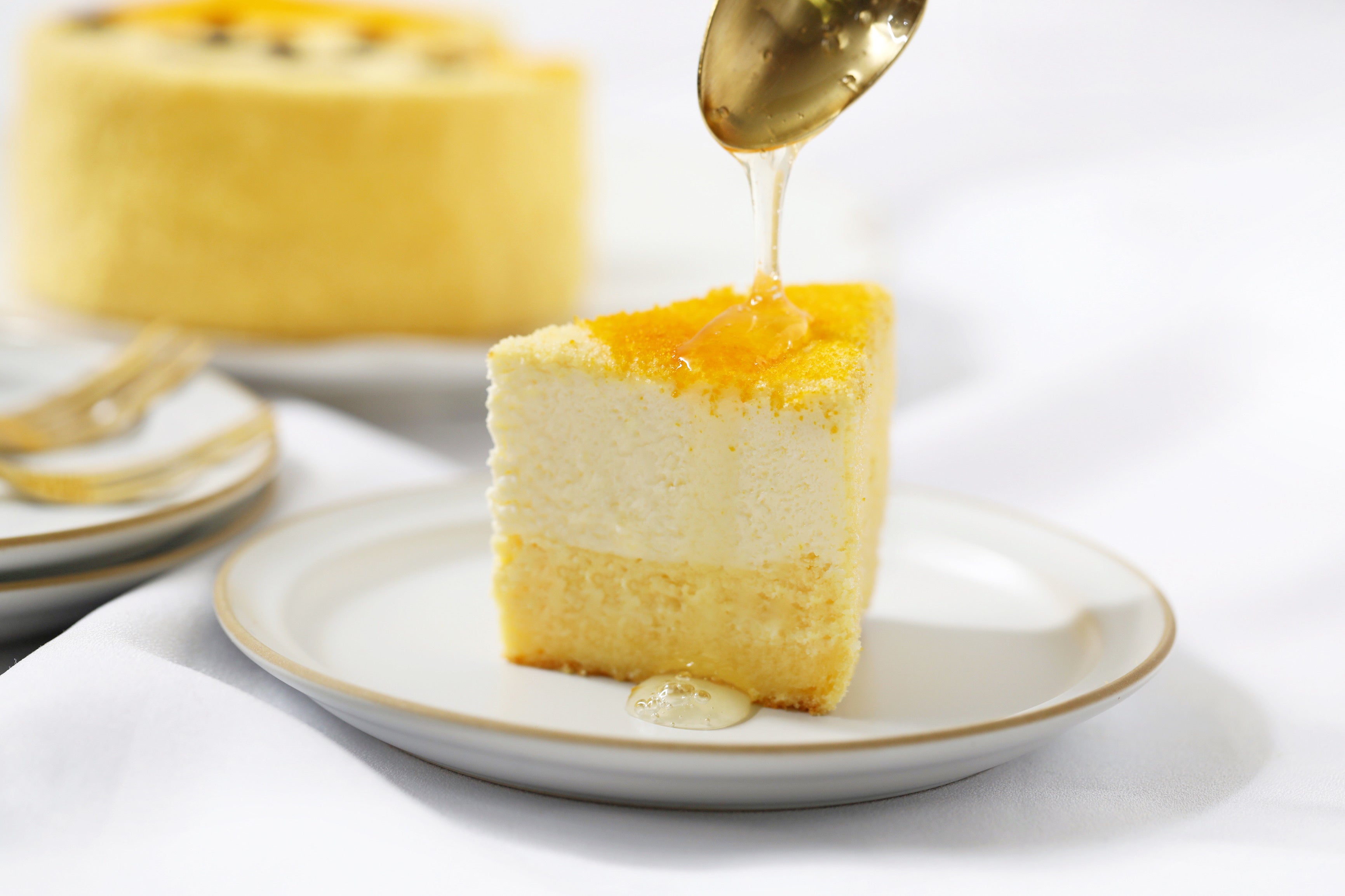 つい写真を撮りたくなるようなキュートな見た目を楽しんだら、チーズのコク深さとマンゴーパウダー、はちみつレモンソースのさっぱりとした風味をぜひご賞味ください。