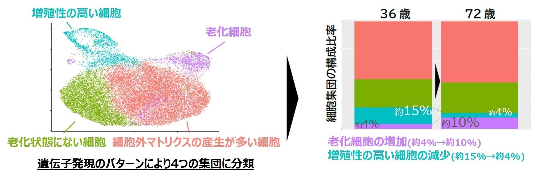 遺伝子発現のパターンから線維芽細胞を、①増殖性の高い細胞、②細胞外マトリクス(※1)の産生が多い細胞、③老化細胞、④老化状態にない細胞、の4つの集団に大別しました。加齢による線維芽細胞の主だった変化としては、老化細胞の増加、増殖性の高い細胞の減少、細胞外マトリクスの産生などの機能低下、が示唆されました。例えば、36歳と72歳のときの線維芽細胞を比較すると、老化細胞の割合は約4%から約10%に増加し、増殖性の高い細胞は約15%から約4%に減少という結果が得られました(図2)。