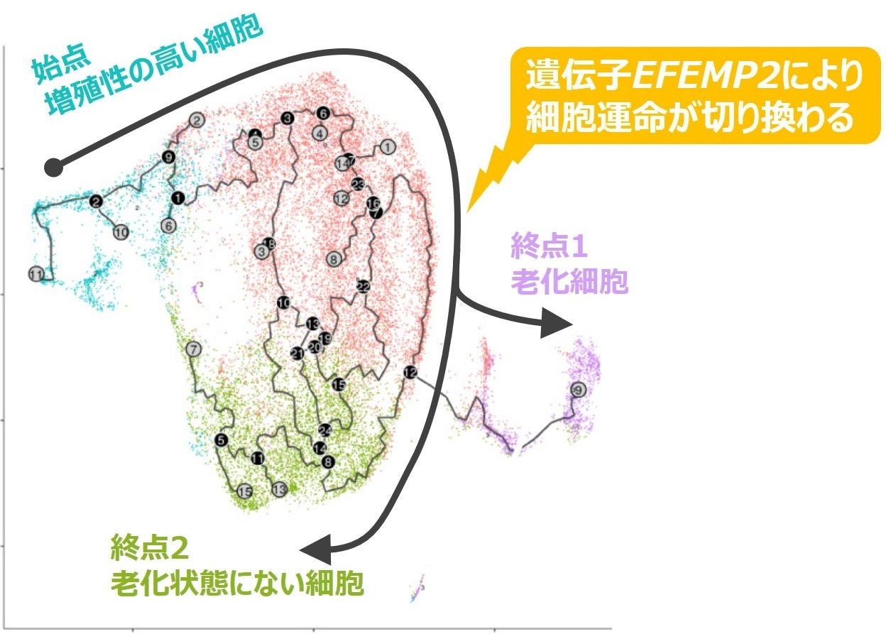 遺伝子発現のパターンから擬似時間軸解析という手法を用いることにより、始点として設定した増殖性の高い細胞集団が、加齢によりどのような細胞状態の変遷を辿るのかを解析しました。その結果、老化した細胞を終点(終点1)とする経路に加え、老化状態にない細胞を終点(終点2)とする、2つの推定分化経路(細胞運命)の存在が推定されました(図1)。そこで、終点2の老化状態にない細胞に特徴的であった遺伝子EFEMP2 に着目し、その発現を抑制した際の細胞老化状態を評価しました。その結果、EFEMP2 の発現を抑制した線維芽細胞では、老化細胞の特徴を示す細胞の増加がみられ、EFEMP2 が線維芽細胞の老化運命の切り換えに関わることが明らかとなりました(図3)。なお、このEFEMP2の抑制による老化細胞の増加は、他の細胞供与者に由来する真皮線維芽細胞でも確認しています。
