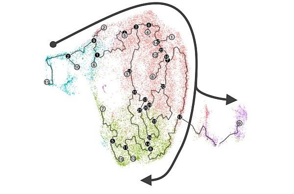 図1 真皮線維芽細胞の集団分布と推定分化経路(細胞運命)の解析結果