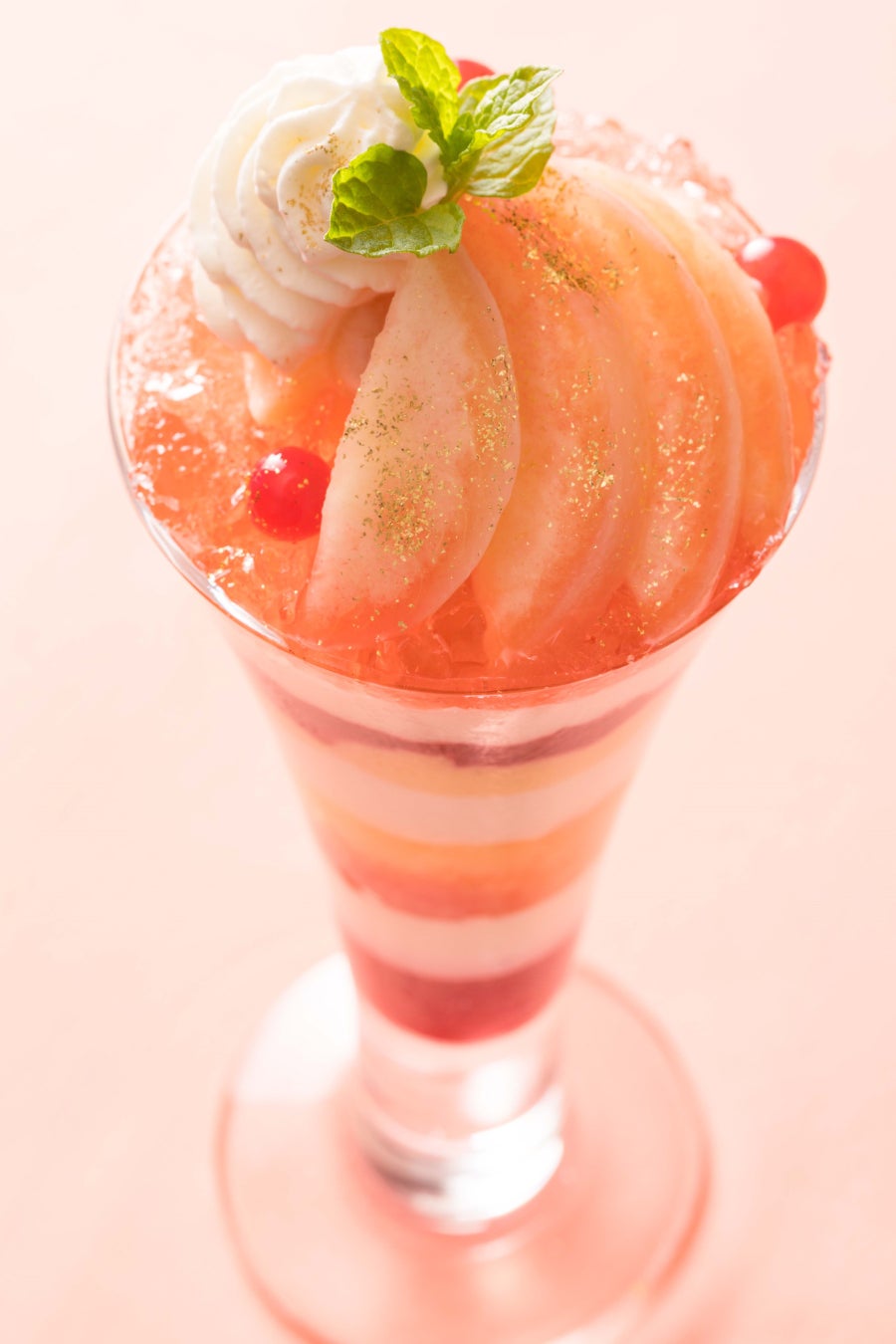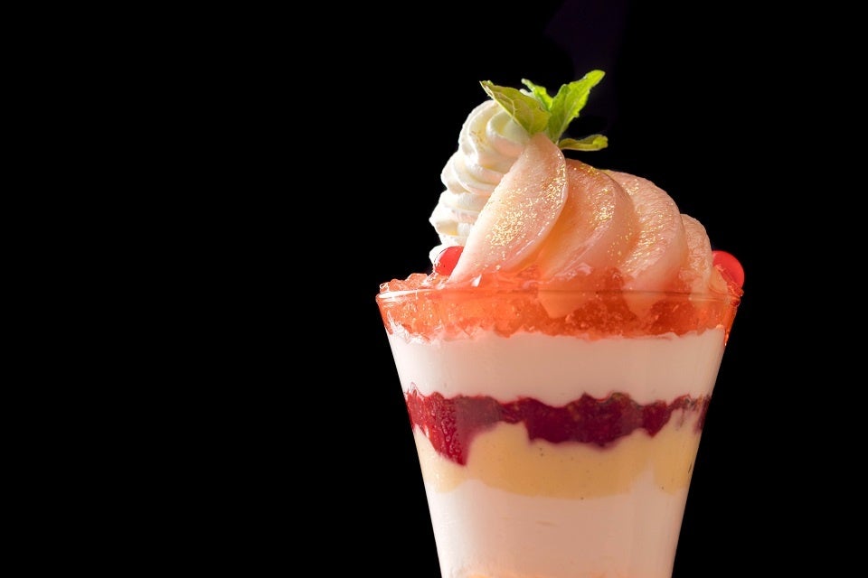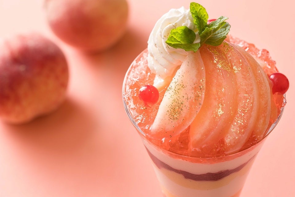 パフェの顔ともなるトップの飾り付けには、フレッシュな桃を贅沢に使用し、鮮やかな層で仕上げた“桃のパフェ”。桃と相性抜群のほんのりと酸味が効いた桃のコンポートジュレや、バニラアイス、生クリームが重なり、食べ進める度に、味や食感の変化がお楽しみいただけます。さらに、フロマージュブランのムースや、ラズベリージュレも重なり、桃のジューシーな食感と共に、最後までさっぱりとお召し上がりいただけます。桃好きにはたまらない、それぞれの層が織りなすハーモニーをお楽しみください。