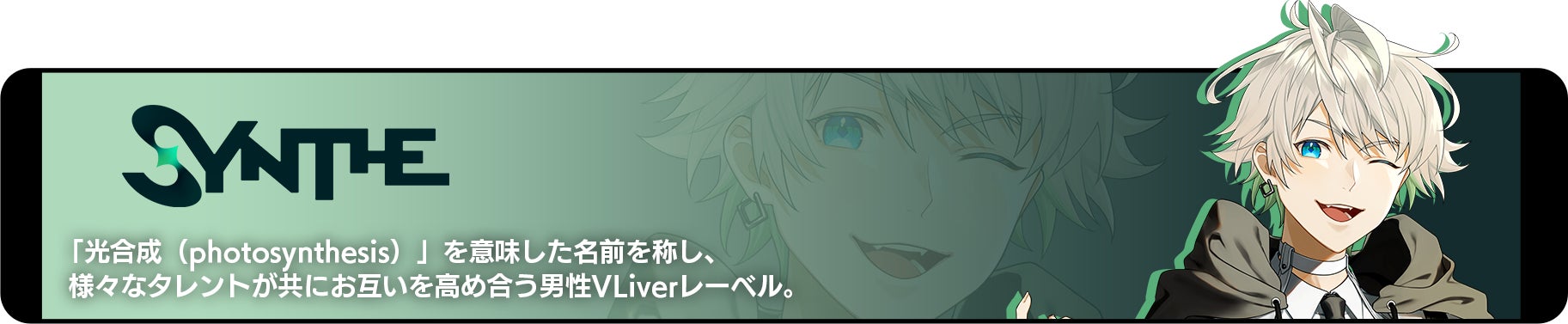 『SYNTHE(シンセ)』は、「光合成(photosynthesis)」を意味する名前のもと、さまざまなタレントが互いに高め合い、共に成長していくことを目指す男性VLiverレーベルです。