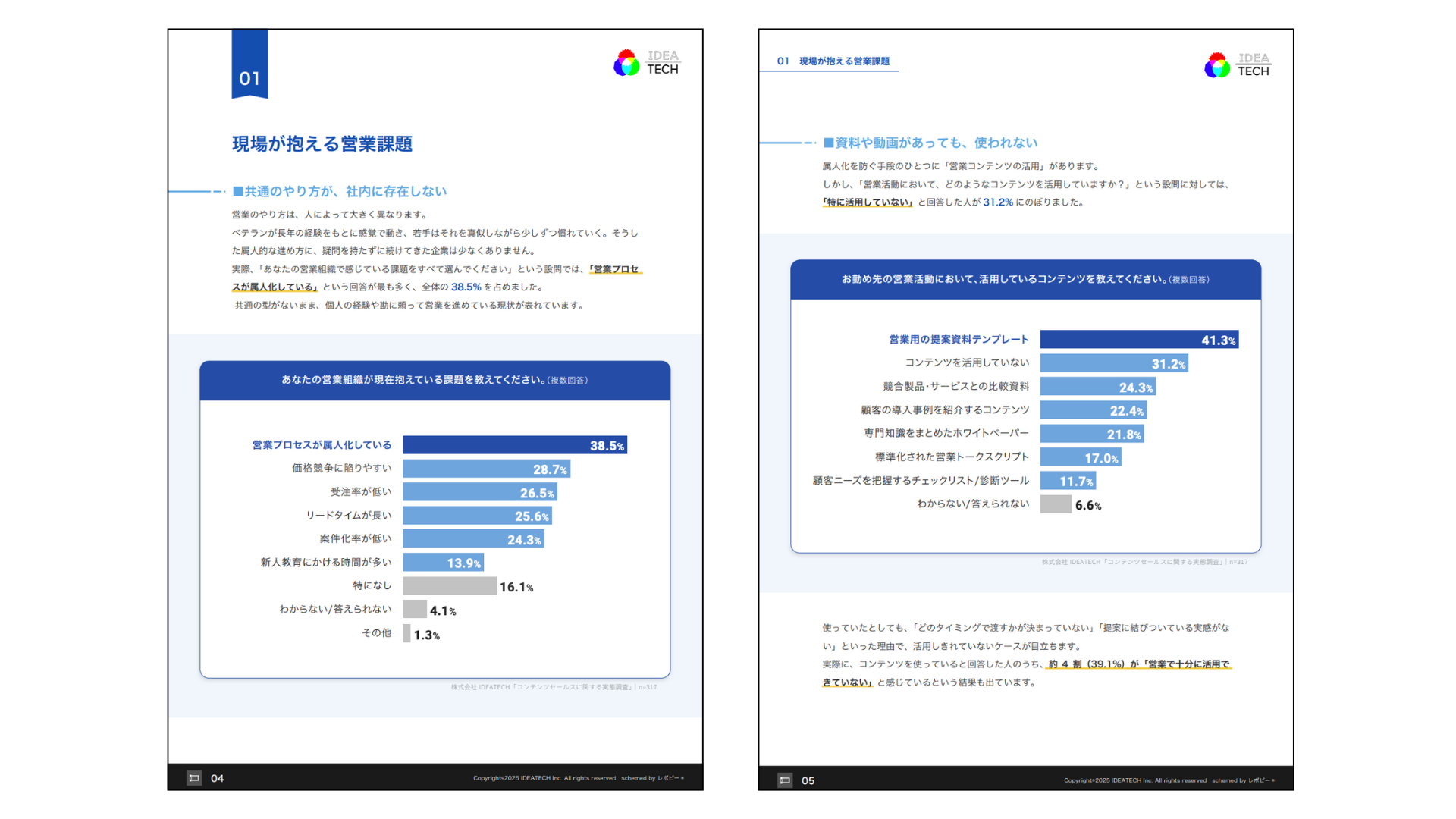 A. 営業コンテンツを作っても「運用体制が整っていない」(34.3%)という理由で活用されないケースが多いためです。社内のどこに資料があるのか分からない、使っても反応が見えない、誰が何を更新するのか決まっていない状態では、ツールがあっても現場で活かされません。営業プロセスの中に組み込み、誰が使い、どう判断するかまでを設計する仕組みが必要です。