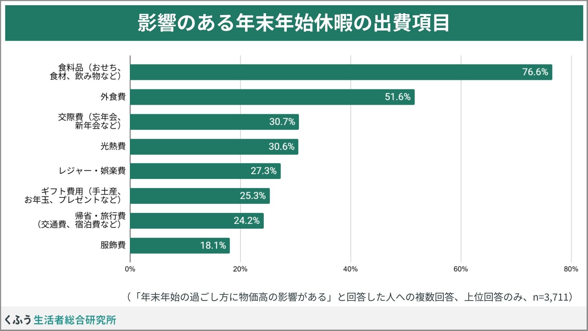年末年始の過ごし方に「物価高の影響がある」と回答した人に、どのような項目への出費に節約志向の影響があるかをたずねたところ、おせちや食材、飲み物などの「食料品」(76.6%)がもっとも多く、「外食費」(51.6%)が続きました。