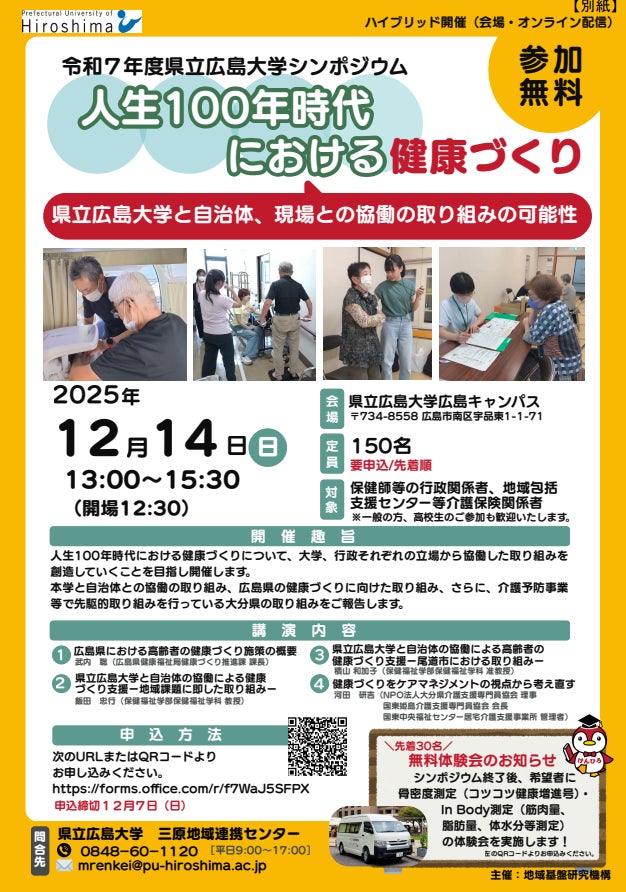 県立広島大学(学長:森永 力、広島市南区)では、この度、本学と自治体、広島県が進めている健康づくりに向けた取り組みを報告する場として、令和7年12月14日(日)にシンポジウムを開催します。