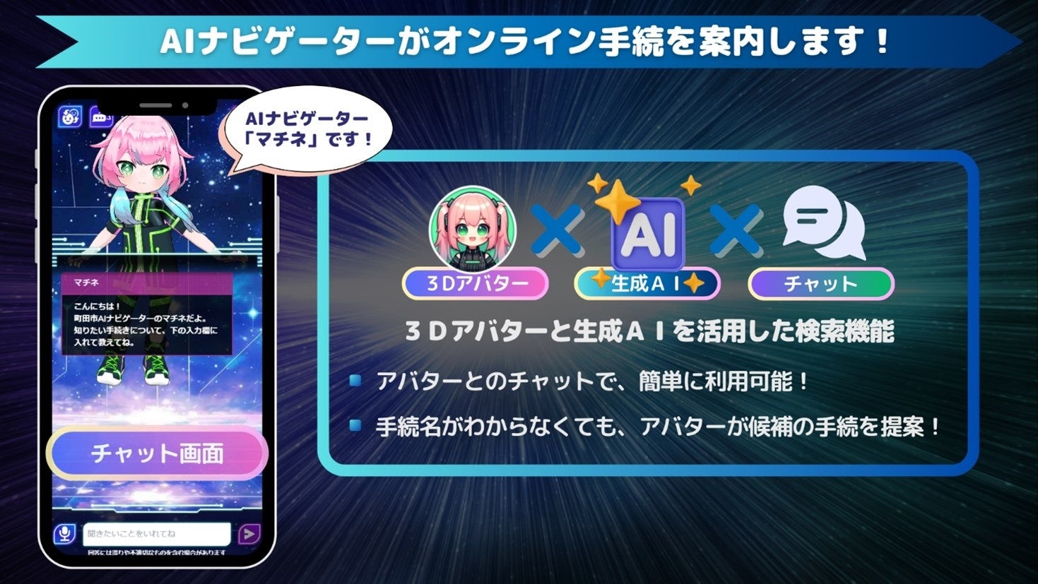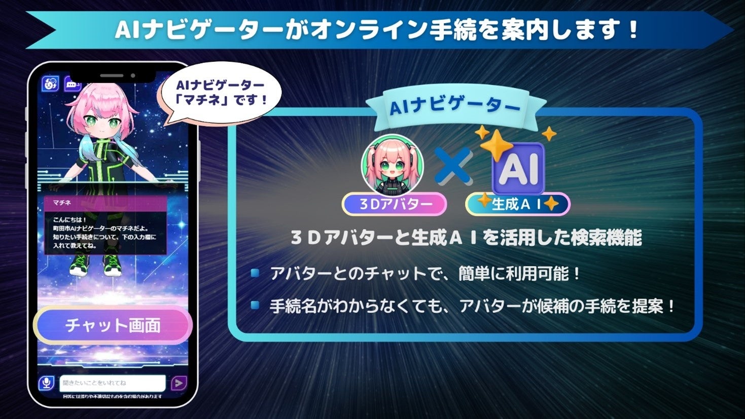 3DアバターとジェネレーティブAIを組み合わせた「AIナビゲーター」と市民のみなさまが、スマートフォンやPCからチャットすることで、オンライン手続をスムーズに進められるよう案内します。