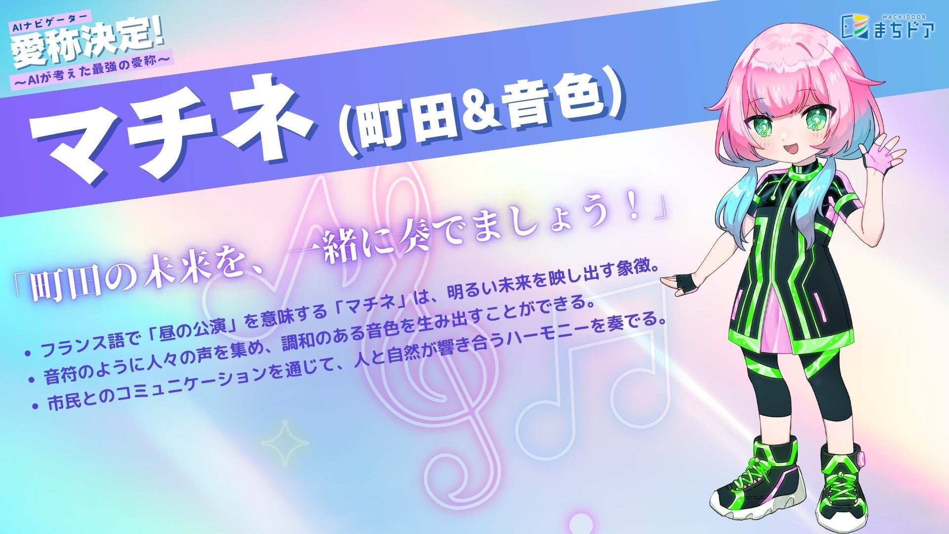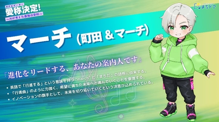 町田市未来づくり研究所が作成した、「Future Machida 2050」で描かれた、町田市の未来シナリオのひとつである、AIなどの先端技術で実現する「登録者1000万世界都市Machida」からやってきた、「AIナビゲーター」という設定です。