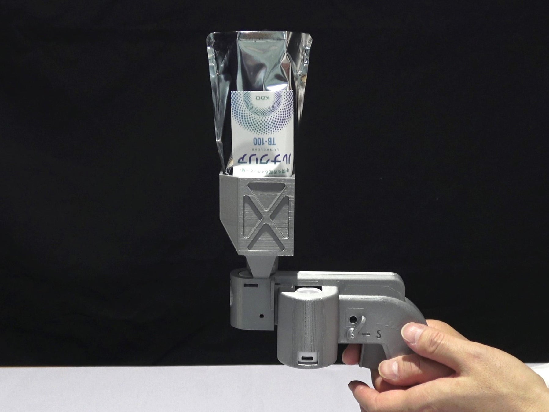 地下トンネル内はスペースが限られているため、作業員が手動で使用できるように、花王の日用品でも使用しているフィルム容器(ラクラクecoパック)を採用し、専用のデバイスも開発しました(図1)。この仕様にすることで、軽量で持ち運びや使い勝手に優れているだけでなく、プラスチック使用量を大幅に削減しています。