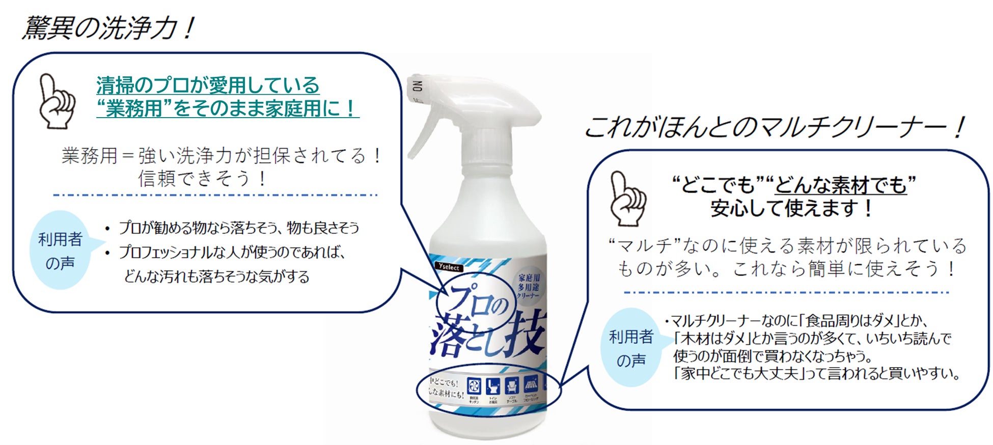 業務用で高い支持を受けているマルチクリーナーが一般家庭で使いやすい泡スプレータイプに生まれ変わり、ヤマダオリジナルブランド「YAMADA SELECT 」として発売。「どこでも」「どんな素材でも」安心して使える点が自社調査においても高い支持を獲得しています。