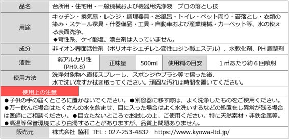 マルチクリーナー「プロの落とし技」は、100%トールオイル・ヤシ油由来の天然成分が主原料であるため、素材や塗装面を痛めることなく、ナノミクロンの力で抜群の洗浄力と消臭のダブル効果を発揮し、汚れ落としやツヤ出し等、多目的にお使いいただけます。