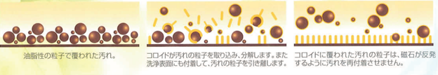 コロイド活性機能により、汚れの固まりは磁力のような作用でコロイドに引き付けられ、コロイド