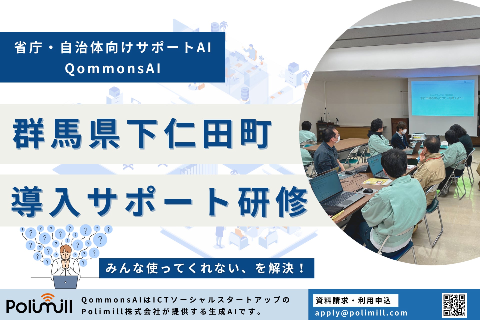 生成AIの社会実装をリードするPolimill株式会社(本社:東京都港区、代表取締役:横田えり)は、2025年1月28日、群馬県下仁田町にて自治体向け生成AI「QommonsAI」の導入サポート研修を実施しました。