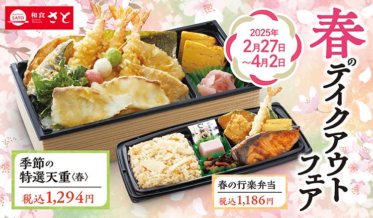 国内197店舗を展開する和食さとでは「真鯛」や「筍」、「菜の花」などの春らしい旬の食材を使ったテイクアウト商品を2月27日(木)から期間限定で販売します。”魚の王様”とも言われる「真鯛」、そしてこの季節が美味しい「菜の花」や「筍」を天ぷらにし、春らしい天重に仕上げた「季節の特選天重<春>」は税込1,294円で販売。真鯛の特徴でもある、淡泊ながら豊かな甘みをお弁当でもお楽しみいただけます。そして、「春の行楽弁当」税込1,186円は、店内でも毎年大人気の「筍ごはん」と、海老の天ぷらや焼き魚などの自慢のおかずを盛合せた行楽にもぴったりなお弁当です。「春のよくばりダブル丼」税込970円は、筍や菜の花、海老の天ぷらが入ったミニ天丼と、さとで人気の牛ステーキ丼がコンビになったよくばりセットです。寒さもだんだんと和らぎ、暖かくなるこれからの季節、いつも和食さとをご利用頂いているお客さまも、初めてのお客さまも、是非さとのテイクアウトをお楽しみください。