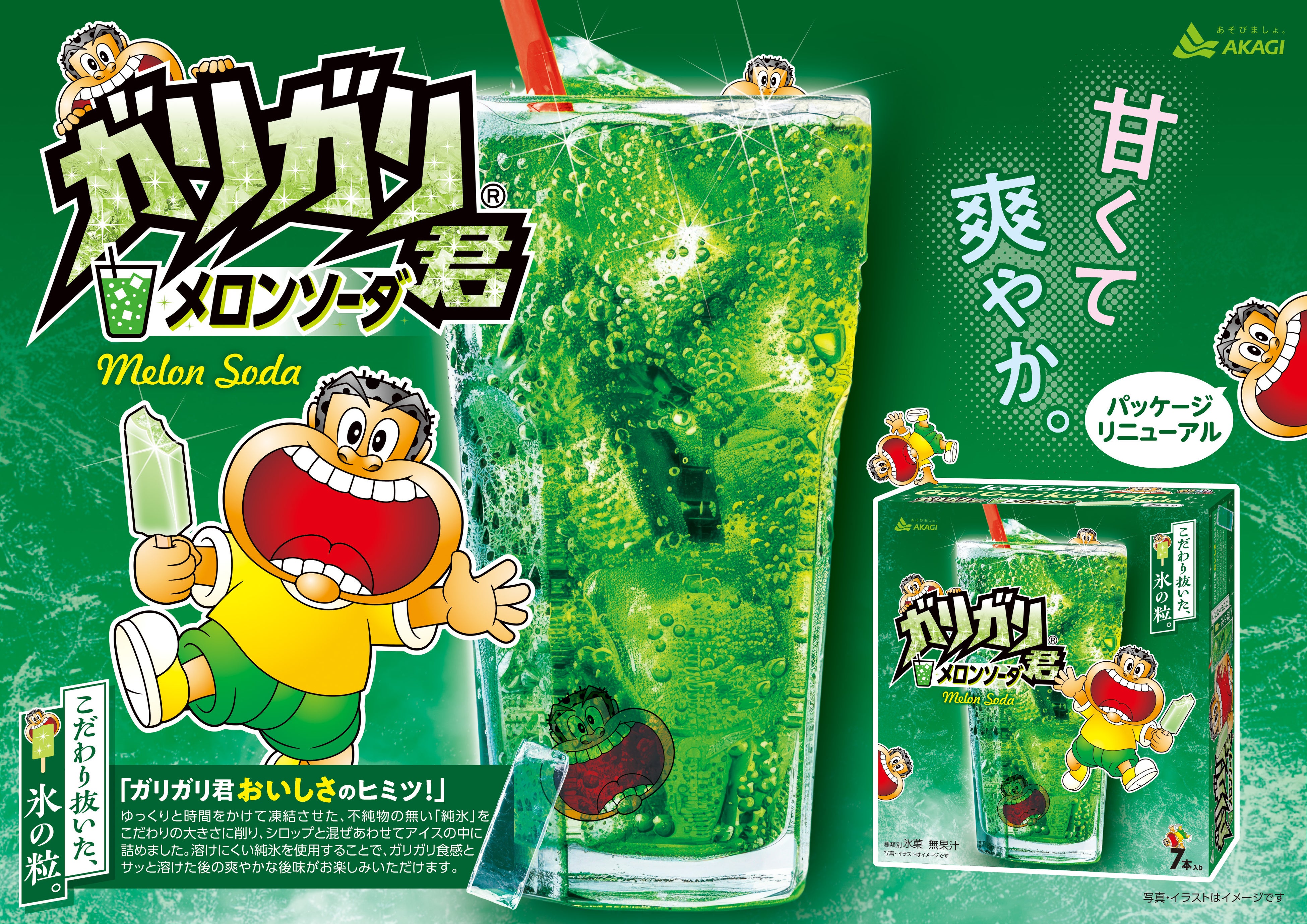 また今回パッケージは、「大人なガリガリ君もぎたてぶどう」には6人、「ガリガリ君メロンソーダ」には7人のガリガリ君をデザインに取り入れ、思わず探したくなるパッケージに仕上げました。