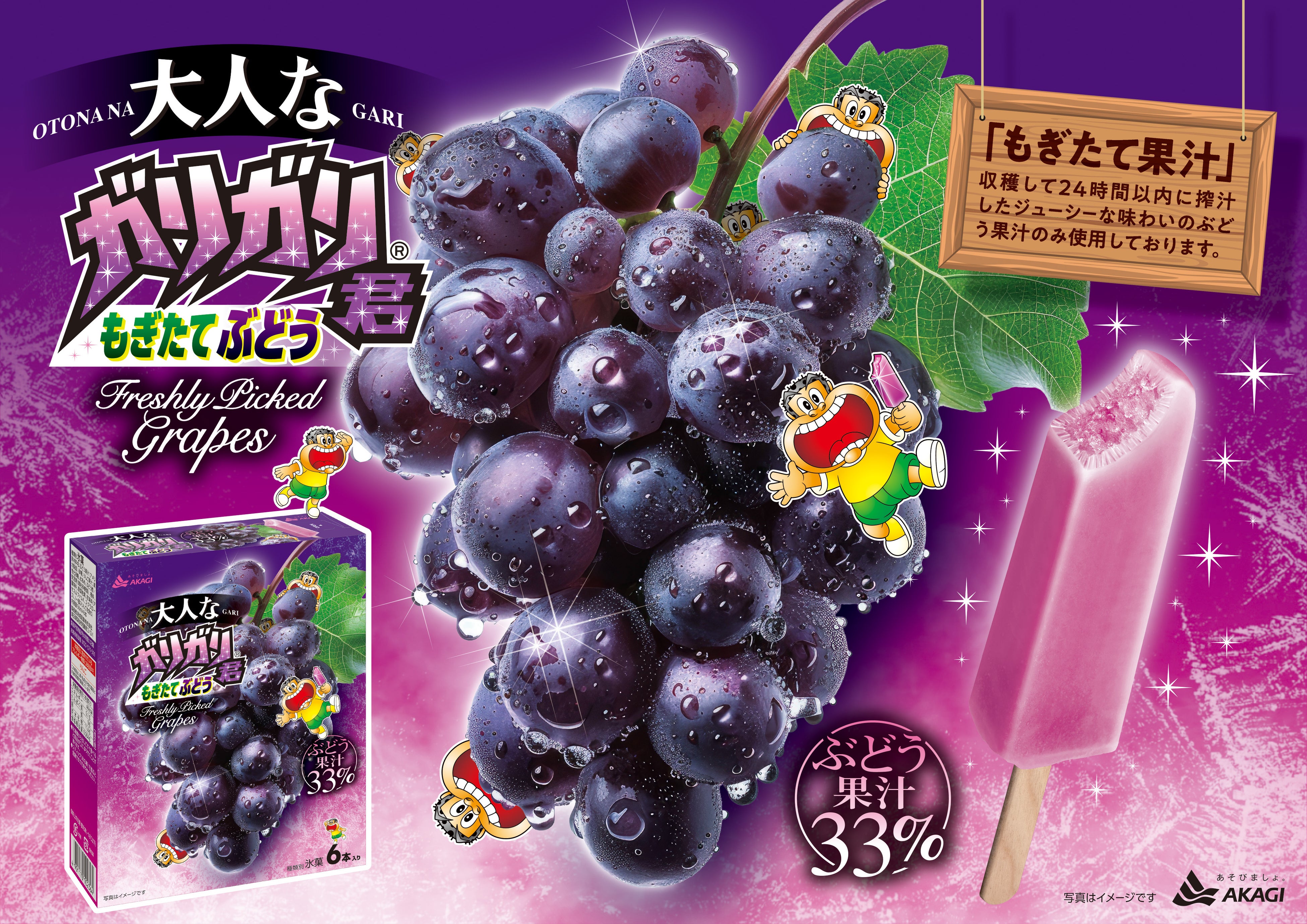 「大人なガリガリ君もぎたてぶどう」は、ぶどうアイスの中に、ジューシーで香り立ちの良さが特長の収穫して24時間以内に搾汁した、もぎたてぶどう果汁かき氷を入れたアイスキャンディーです。ぶどう果汁を33%使用した、本格的な果汁感が味わえる商品です。