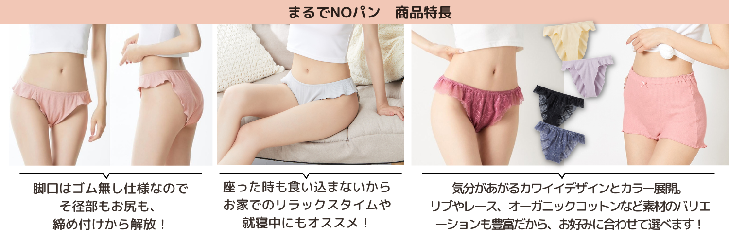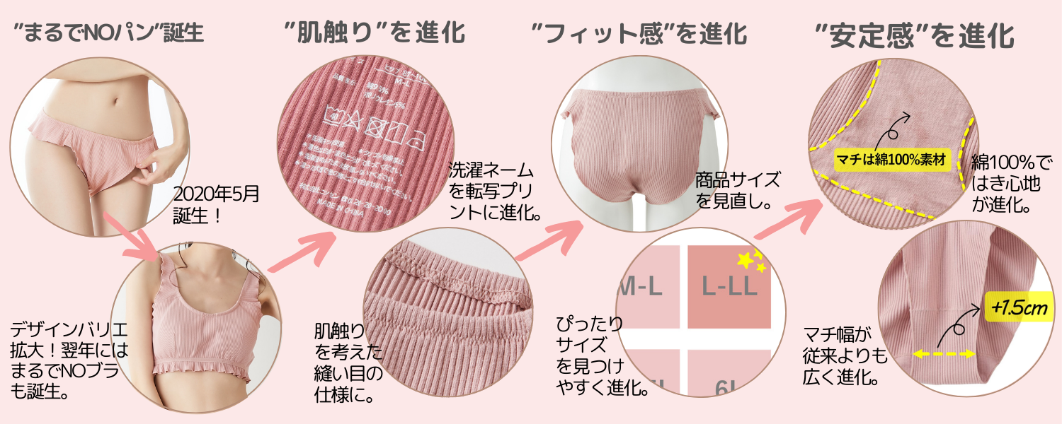 「一人ひとりの心と体に寄り添い、最も適したインナーをご提供すること」をブランドメッセージとして、お客様の声を活かした商品開発を徹底しているニッセンレディスインナーでは、「そ径部にゴムが当たって痛い」というお客様の声から、ショーツのゴムによる締め付けを軽減できる、ふんどし型ショーツの開発を開始。お客様の声でも、特に多くのご意見があった「デザイン性と価格への不満」を解消する商品として、『まるでNOパン』を2020年5月から販売開始しました。