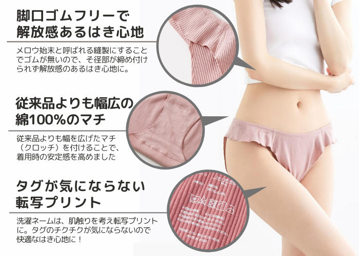 メロウ始末と呼ばれる縫製にすることでゴムが無く、黒ずみの原因となる摩擦がおきづらいゆったりとしたはき心地のショーツ。これまでにない圧倒的な解放感が病みつきになるとリピーター続出。締め付けや食い込みが気になる方、また、リラックスしたい時、夜寝る時にもオススメです。シリーズ商品は、現在8アイテム販売中です。