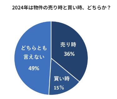 「2024年は物件の売り時と買い時、どちらか?」と尋ねた結果は、「どちらとも言えない」(49%)が最多でした。「売り時だと思う」は36%で、「買い時だと思う」の15%を上回っています。