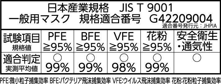 「JIS T9001」は、一般販売向けマスクの規格で、捕集機能(PFE、BFE、VFE、花粉)と圧力損失(通気性)、安全・衛生項目を規定しています。