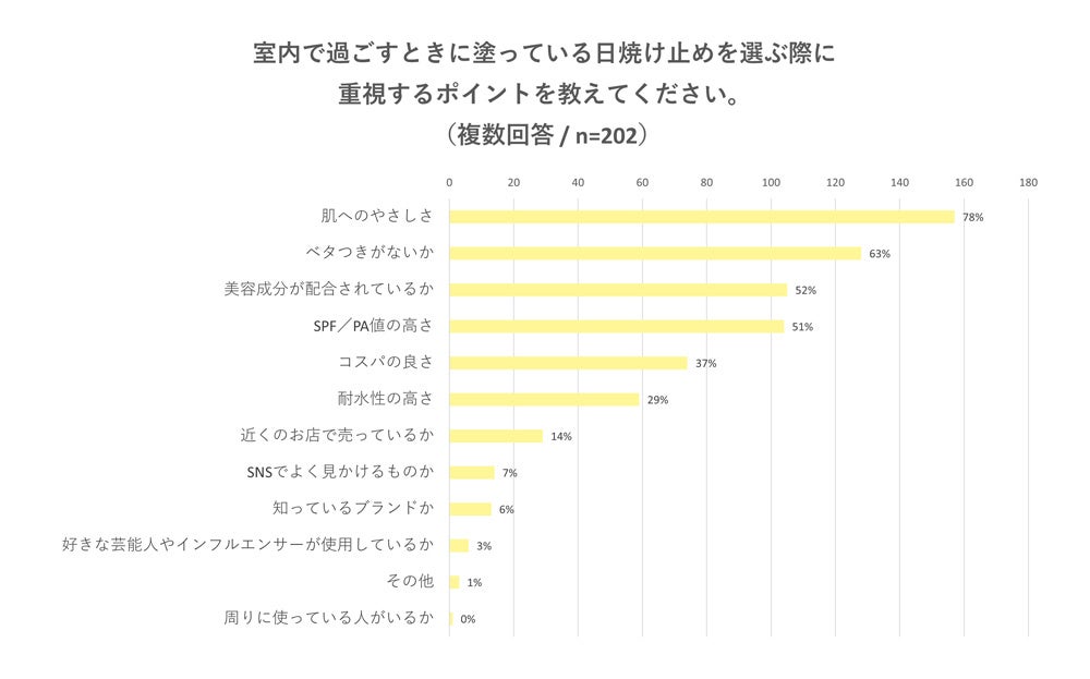 「ベタつきがないか」という点は屋外・室内共通ですが、屋外で最も多くの回答が集まった「SPF/PA値の高さ」は4位という結果になり、代わりに「肌へのやさしさ」「美容成分が配合されているか」を重視する方の割合が増加しました。