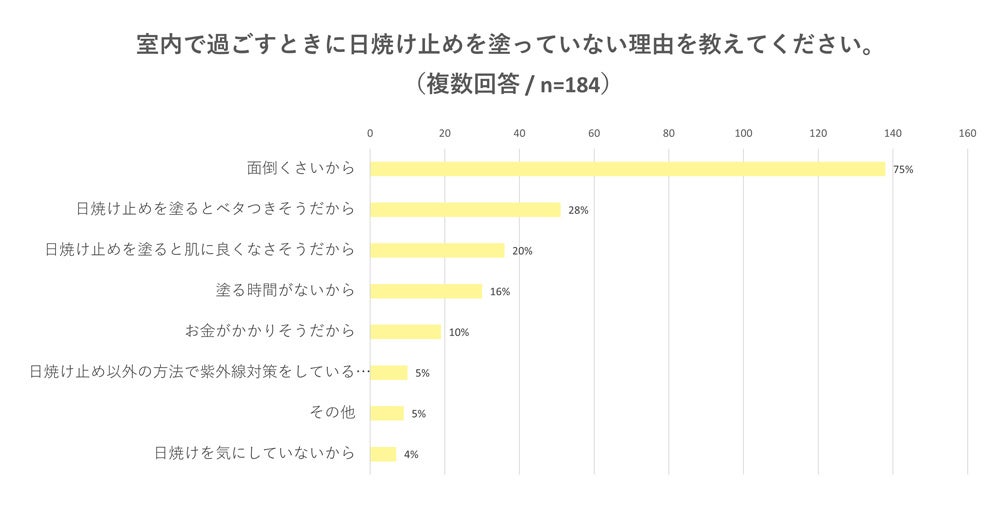そして、日焼け止めを塗っていない理由としては、室内でも「面倒くさいから」という回答が75%と多くの割合を占め、屋外以上に他に差をつける結果となりました。