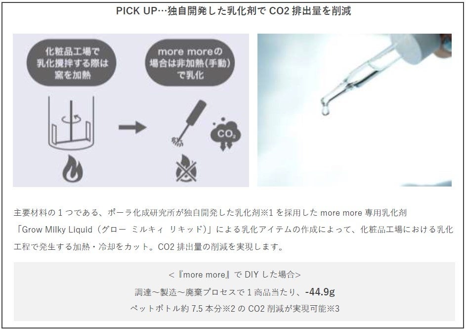 ・新たな乳化技術により、店舗で行うDIY作業におけるミキサー撹拌のため、これまでに発生しなかったCO2排出量が生まれる。当該排出量は『more more』によるCO2削減量より控除