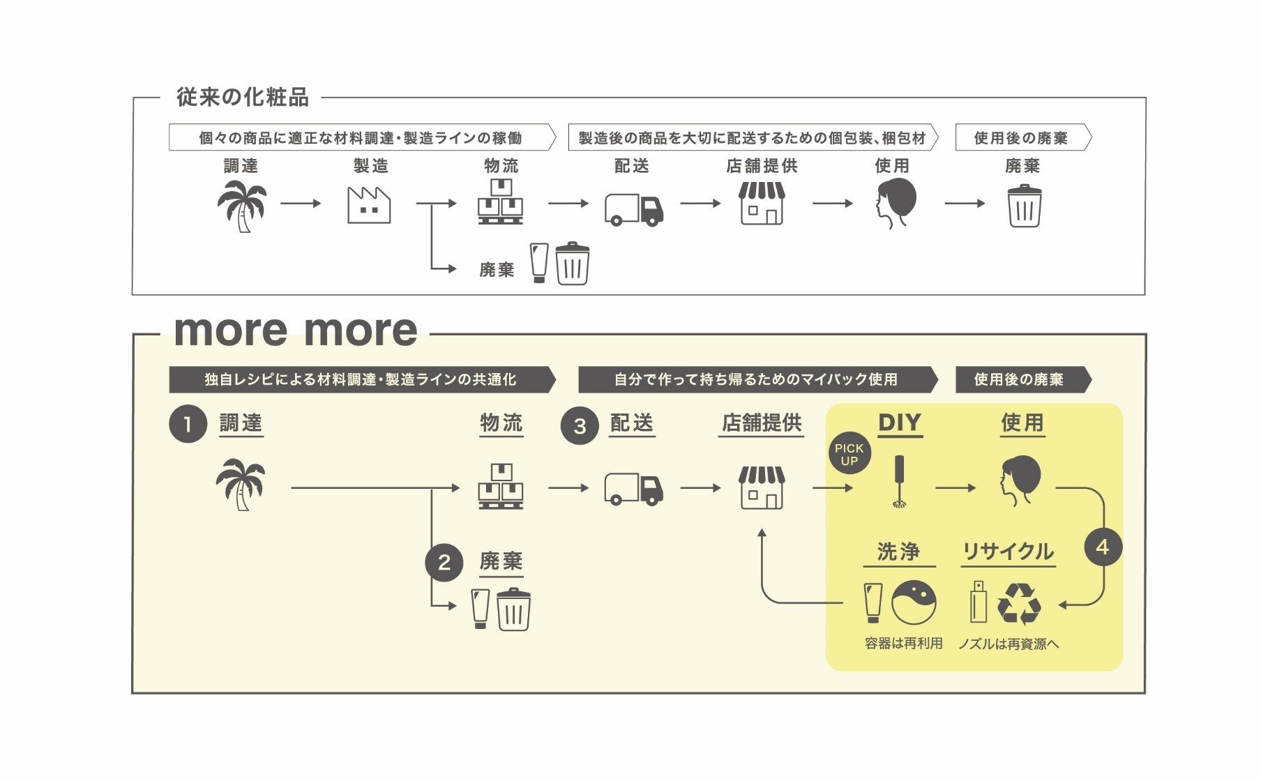 『more more』は、「どうしたらもっと自分や社会・環境がここちよくなるだろう?」と想像する力や、美容を楽しむ気持ちを原動力に、ビューティーを通じてソーシャルインパクトの最大化を目指す“Collective Beauty”を掲げています。従来の「ブランドと消費者」という関係から新たに、共通のビジョンに向けて、ユーザーをはじめ様々なパートナーに参画いただき、協働し合うことで、ここちよい空間を自分から社会・環境へと拡張できるサービス体験の実現を目指しています。具体的には、カスタマイズしたDIYセルフケアアイテムのオリジナルレシピ情報を料理のように、ユーザー同士でシェアすることで選択肢が広がる仕組みや、コミュニティ活動を通じたソーシャルアクションの展開等を予定しています。