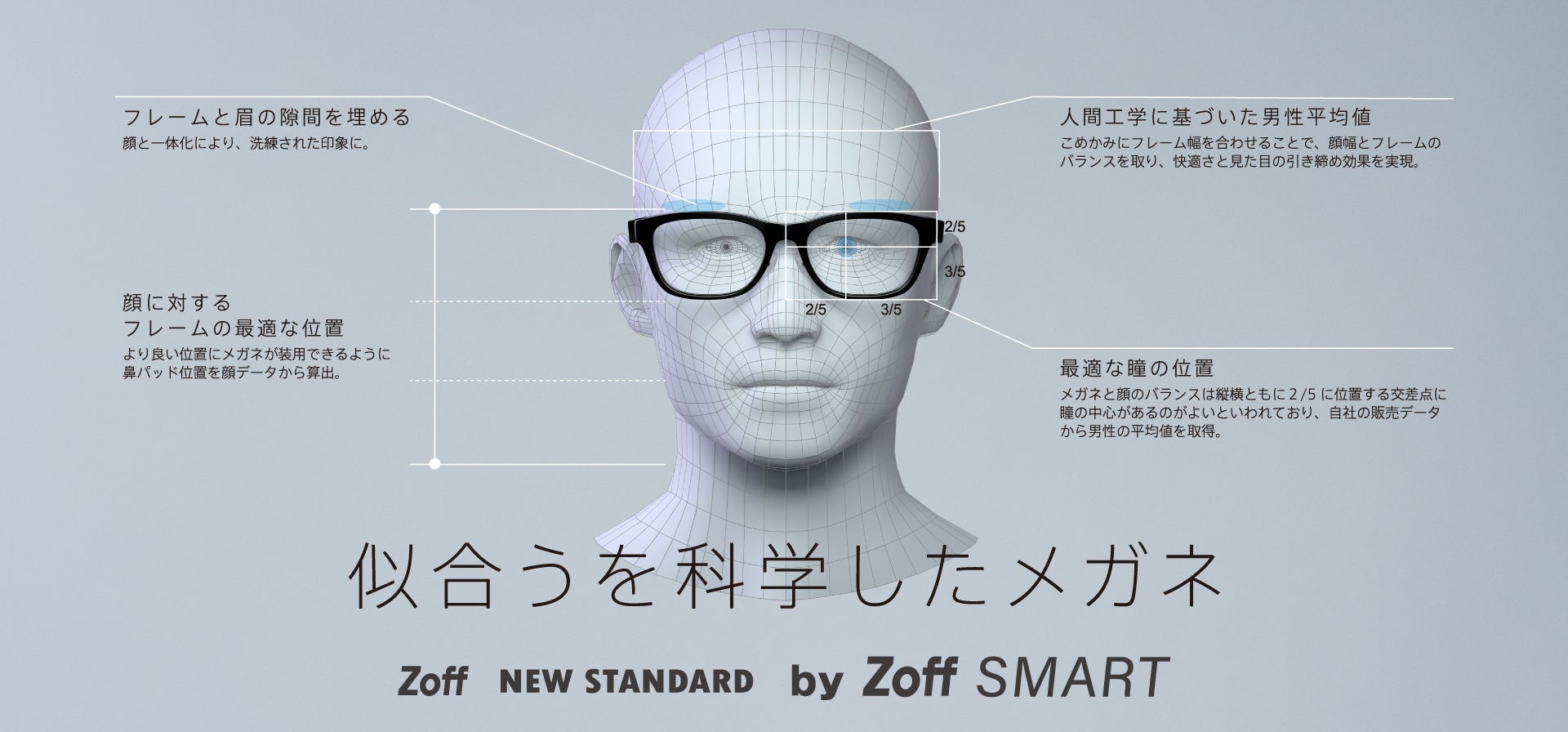 今年1月に発売し好評を得た「Zoff NEW STANDARD」は、Zoffの研究・開発機関である「ZEPS(※)」と共同開発されたシリーズ。約2,000人の顔画像から30代男性を抽出し、平均顔をAIが生成。それをもとにデザイン、設計された「似合うを科学したメガネ」です。