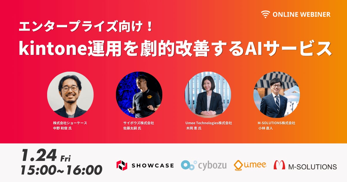 企業と顧客をつなぐDXクラウドサービスを展開する株式会社ショーケース(東京都港区、代表取締役社長:平野井順一、証券コード:3909、以下ショーケース)は、1月24日(金)15:00〜「エンタープライズ向け!kintone運用を劇的改善するAIサービス」と題した無料オンラインセミナーを開催いたします。