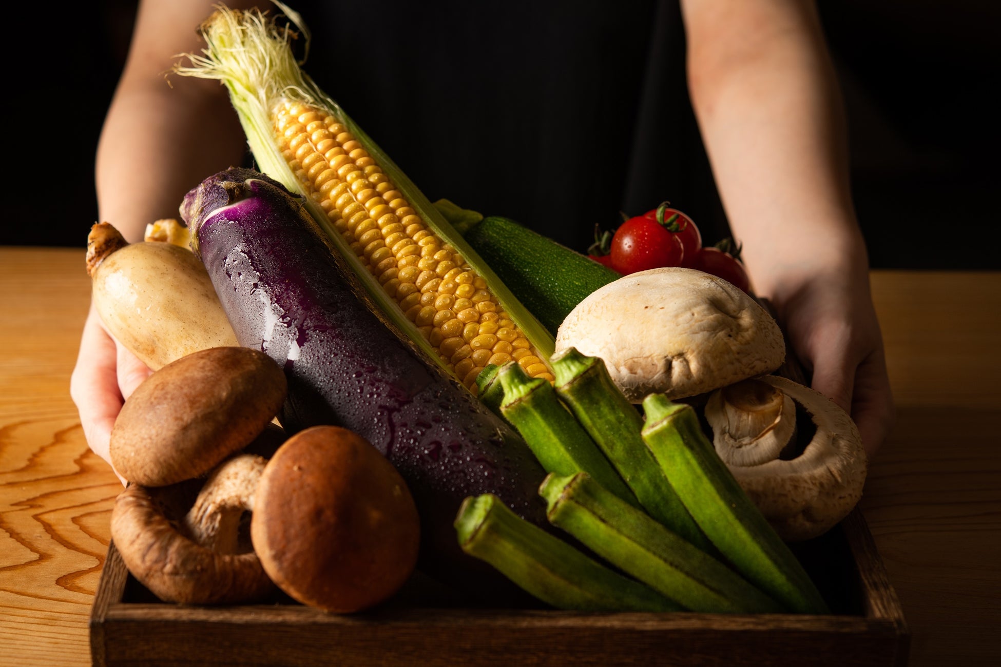 店内では、カウンター越しに研鑽を積んだ焼き師が炭火で焼鳥を焼き上げ、ホールスタッフが季節ごとに各地から届いた新鮮野菜を「岡持ち」に入れてご紹介しています。