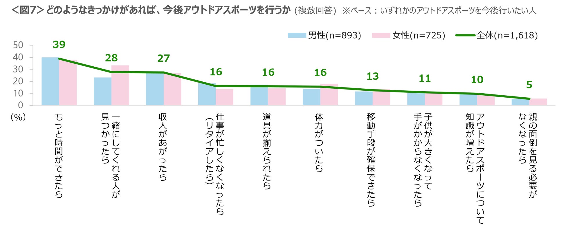実施する際のきっかけは、「もっと時間ができたら」が最多で、「一緒にしてくれる人が見つかったら」「収入があがったら」と続く。女性は一緒にしてくれる人を望む声が高かった。<図7>