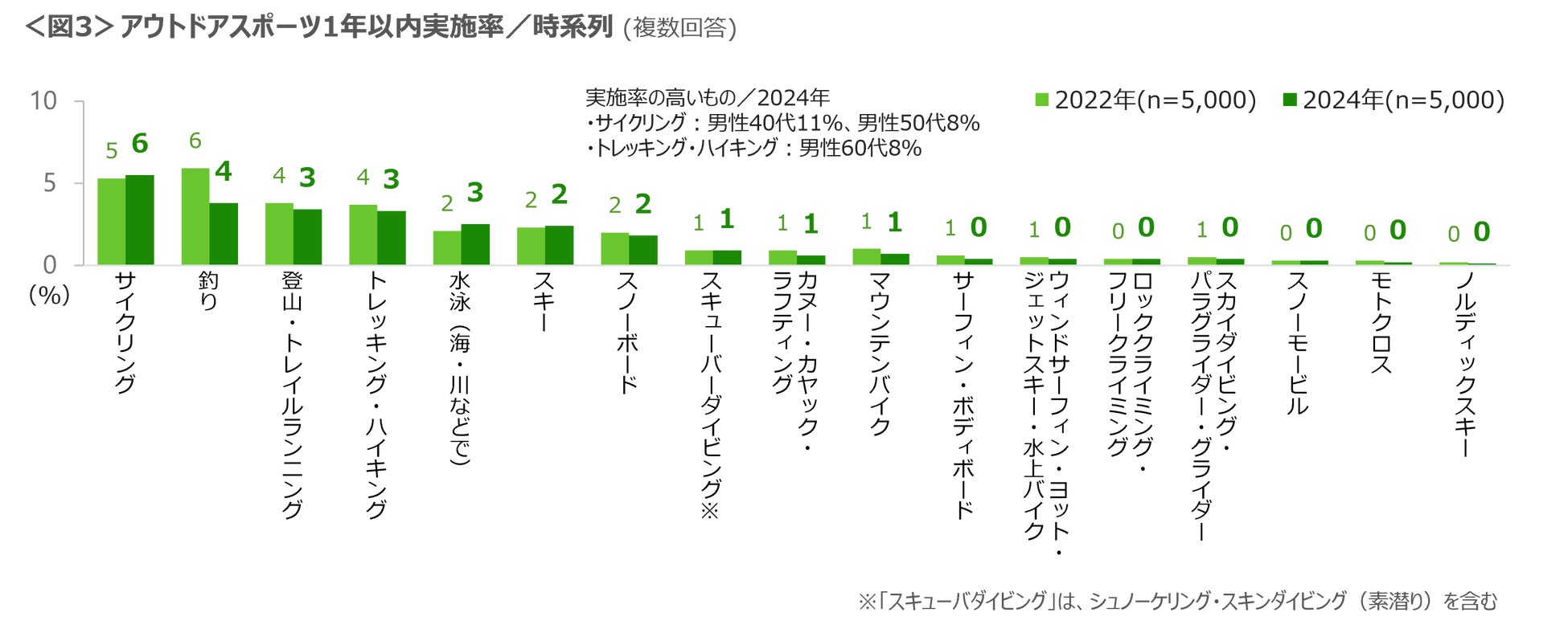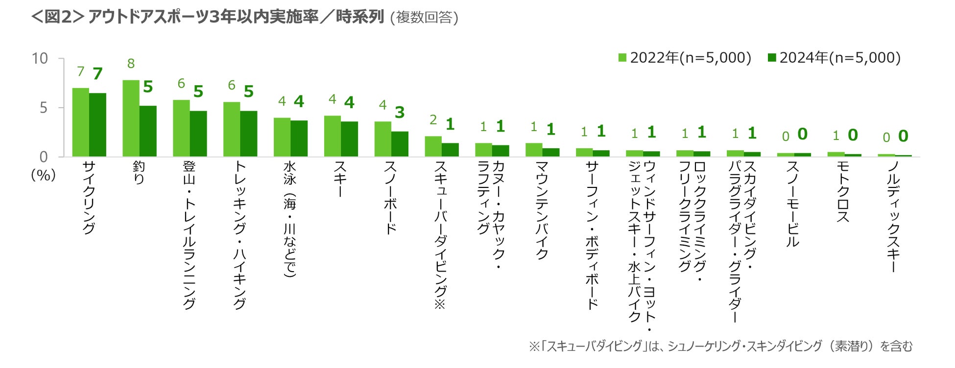 2022年と比較し、3年以内アウトドアスポーツ実施率は各種ともに同率またはやや低下していた。<図2>