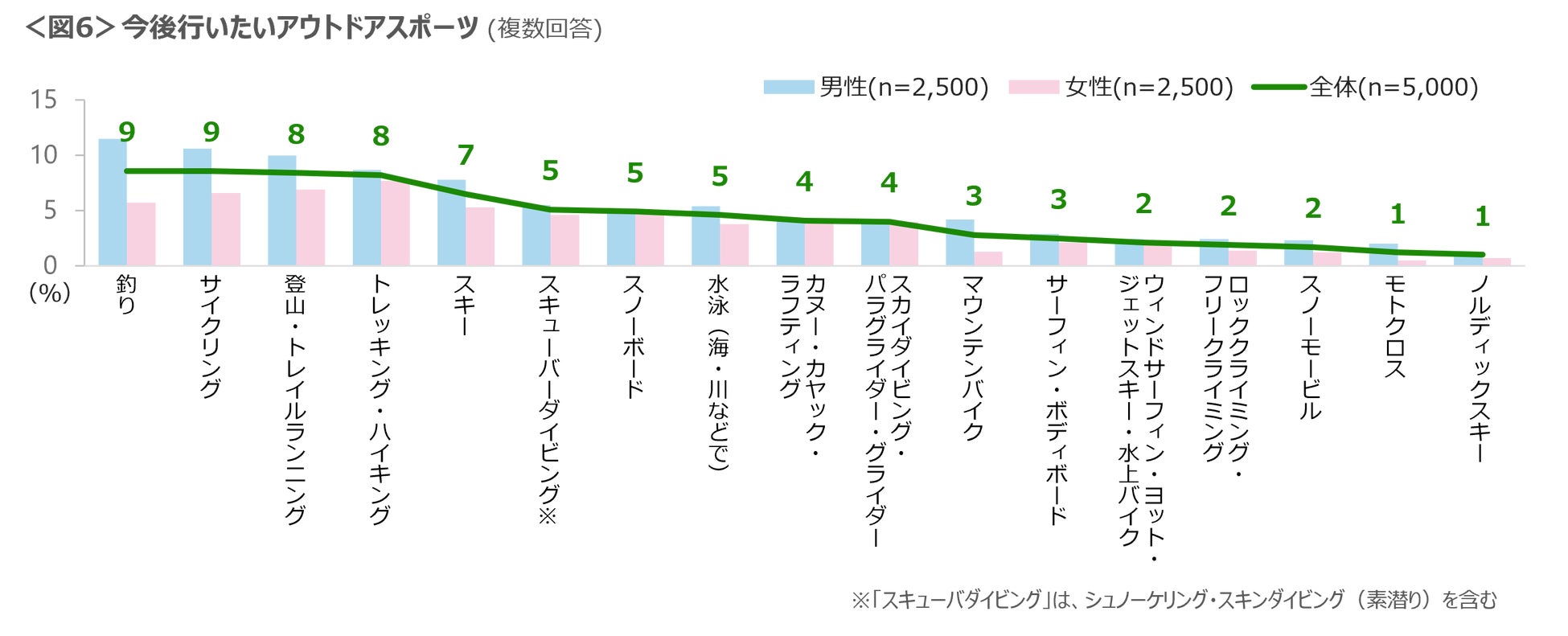 今後行いたいものは、男性が「釣り」「サイクリング」「登山・トレイルランニング」で10~12%、女性は「トレッキング・ハイキング」「登山・トレイルランニング」「サイクリング」で7~8%。<図6>