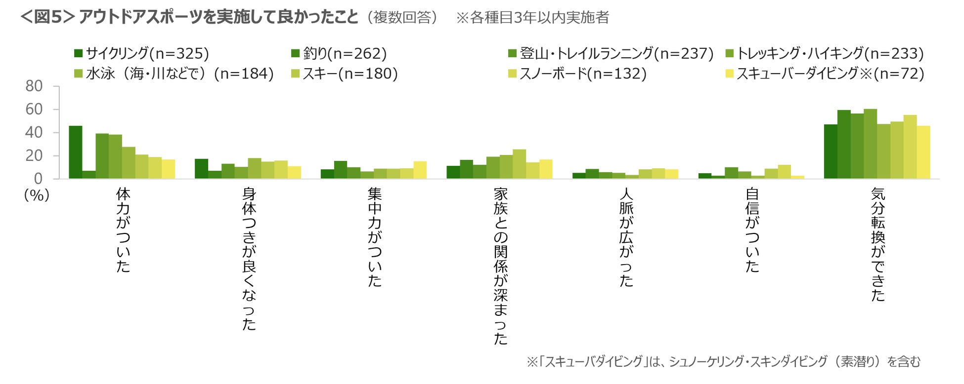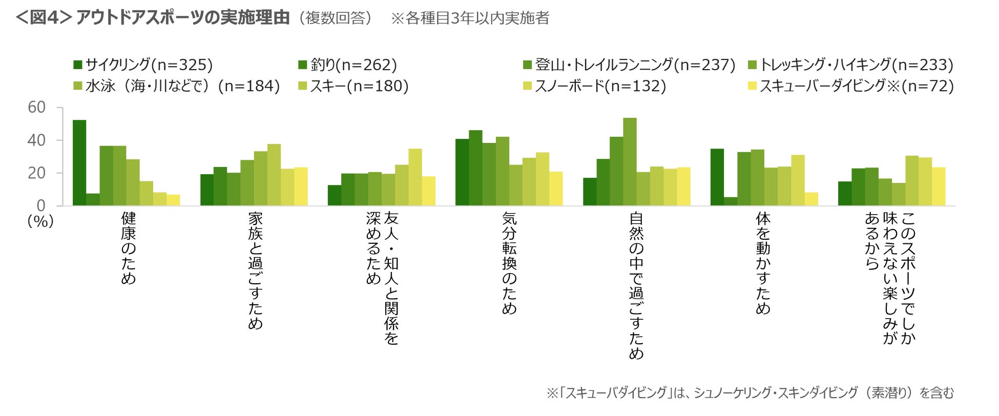 3年以内に実施したアウトドアスポーツの種別ごとに実施理由や実施して良かったことを聴取した。実施理由は「自然の中で過ごす」「気分転換」「健康」が全般的に高い。特に「自然の中で過ごす」は、トレッキング・ハイキング、登山・トレイルランニング、「健康」はサイクリングの実施者で高い傾向にある。<図4>