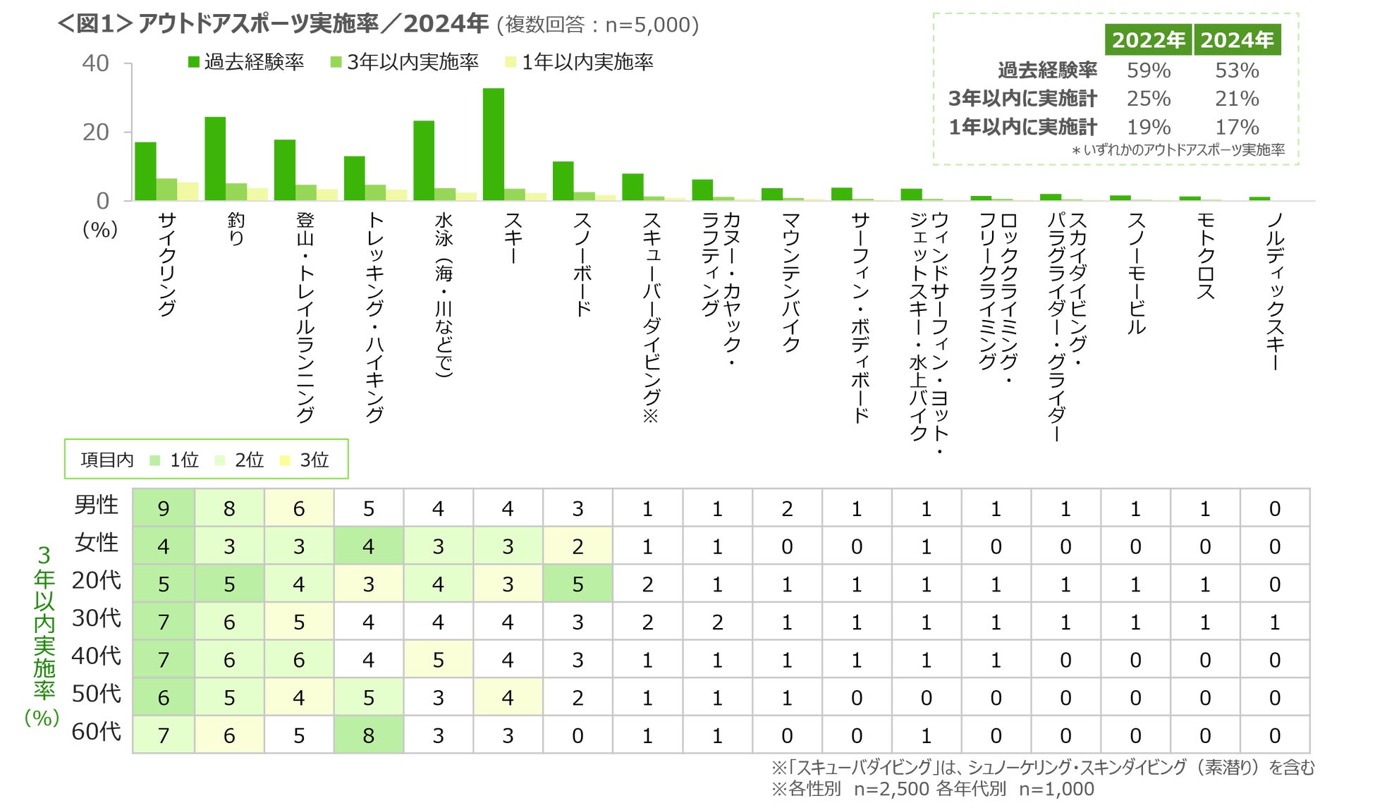 アウトドアスポーツの実施経験者は53%、直近3年以内は21%、1年以内は17%である。直近3年以内の実施率のTOP5は、「サイクリング」「釣り」「登山・トレイルランニング」「トレッキング・ハイキング」「水泳(海・川など)」。いずれもアウトドアスポーツ実施率は男性で高い。年代別の直近3年以内実施率のTOPでは、20代の「釣り」「サイクリング」、30~50代が「サイクリング」、60代「トレッキング・ハイキング」であった。20代のみ「スノーボード」が3位にランクイン。<図1>