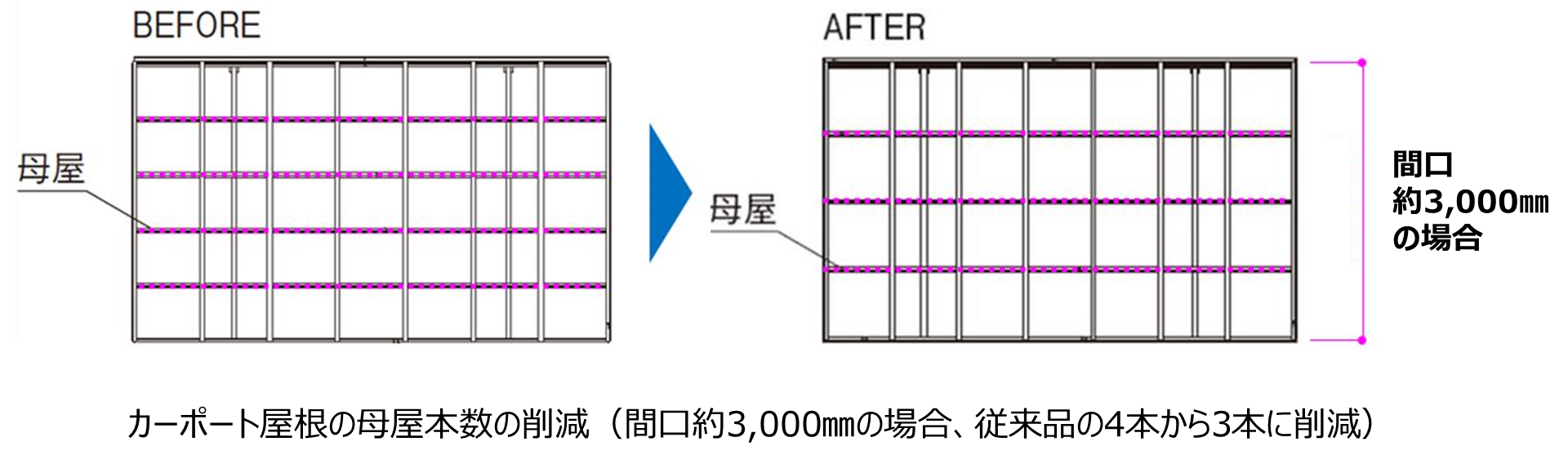 カーポート屋根の骨組みを構成する部材である母屋(もや)本数について、片側支持タイプの間口約3,000㎜は従来の4本から3本へ削減、両側支持タイプの間口約6,000㎜は8本から6本へ削減しています。