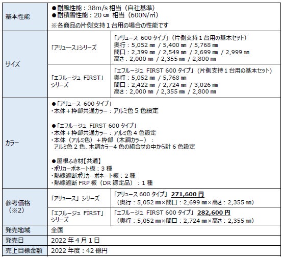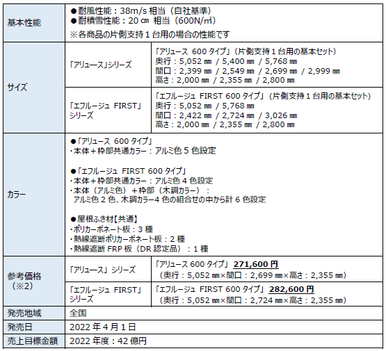 機能性・意匠性・施工性を更に進化させた次世代スタンダードカーポート「アリュース 600 タイプ」、「エフルージュ FIRST 600 タイプ」を発売