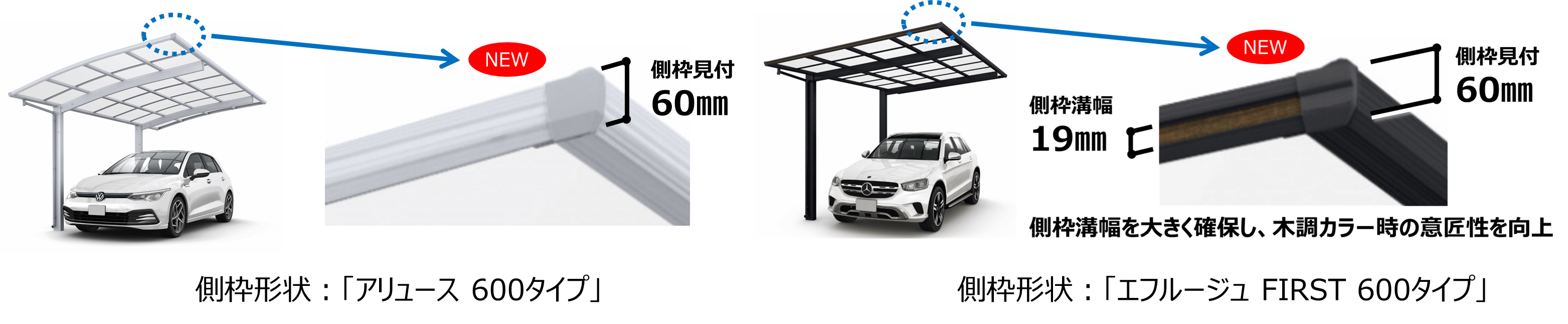 「アリュース 600タイプ」は、側枠見付寸法を既存シリーズの70㎜に対して60㎜にすることで、アール屋根が持つ優しい印象を踏襲しつつ、スリムで軽快かつソリッドな枠形状としています。「エフルージュ FIRST 600タイプ」は、デザインの特長である側枠の溝幅を既存シリーズよりも大きく確保することで、特に溝部が木調カラー時の意匠性を向上させました。