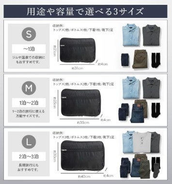 着用前の衣類・使用後の衣類・小物類を分けて収納できる3室構造を採用し、圧縮しながら整理できるため、スーツケースやバッグの中をすっきり保ち、移動中も中身を把握しやすくなっています。