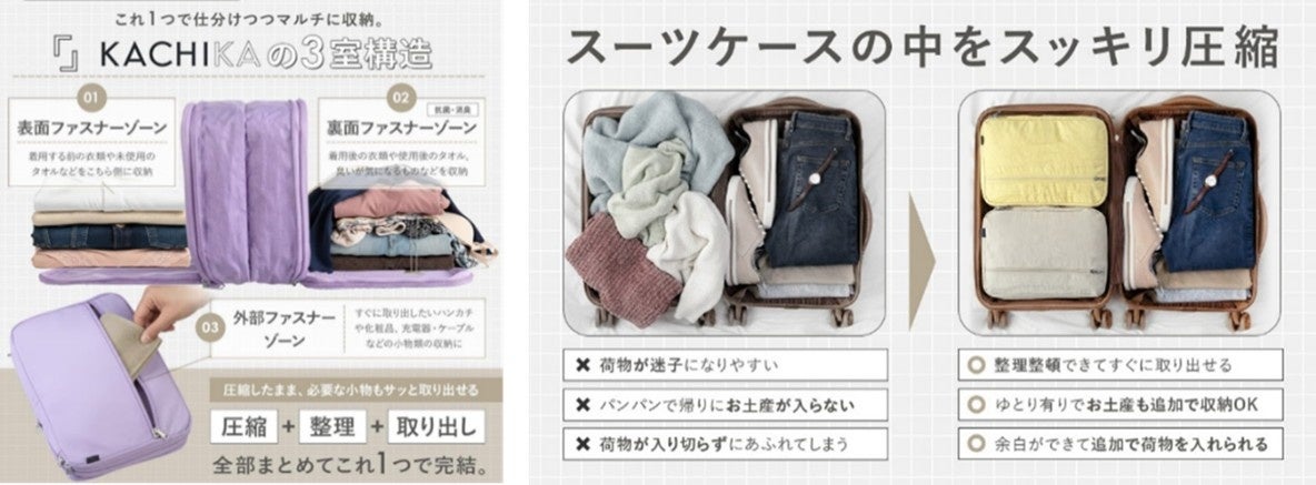KACHIKAの圧縮ポーチは、容量を減らすことだけを目的とした従来品とは異なり、旅行や出張で起こりがちな「探しにくい」「中で混ざる」「取り出しづらい」といったストレスを、構造そのものから見直して解決する新発想のアイテムです。