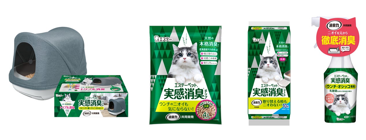 猫ちゃんのトイレのニオイに効果の高い北海道産モミの木(トドマツ)の粉体を配合した「実感消臭本体セット」、「実感消臭チップ」、「実感消臭シート」と、乳酸菌生まれの消臭成分と北海道産モミの木(トドマツ)の樹木水を配合した猫用消臭剤「実感消臭スプレー 猫用」、「実感消臭 置き型 猫用」をラインナップしています。