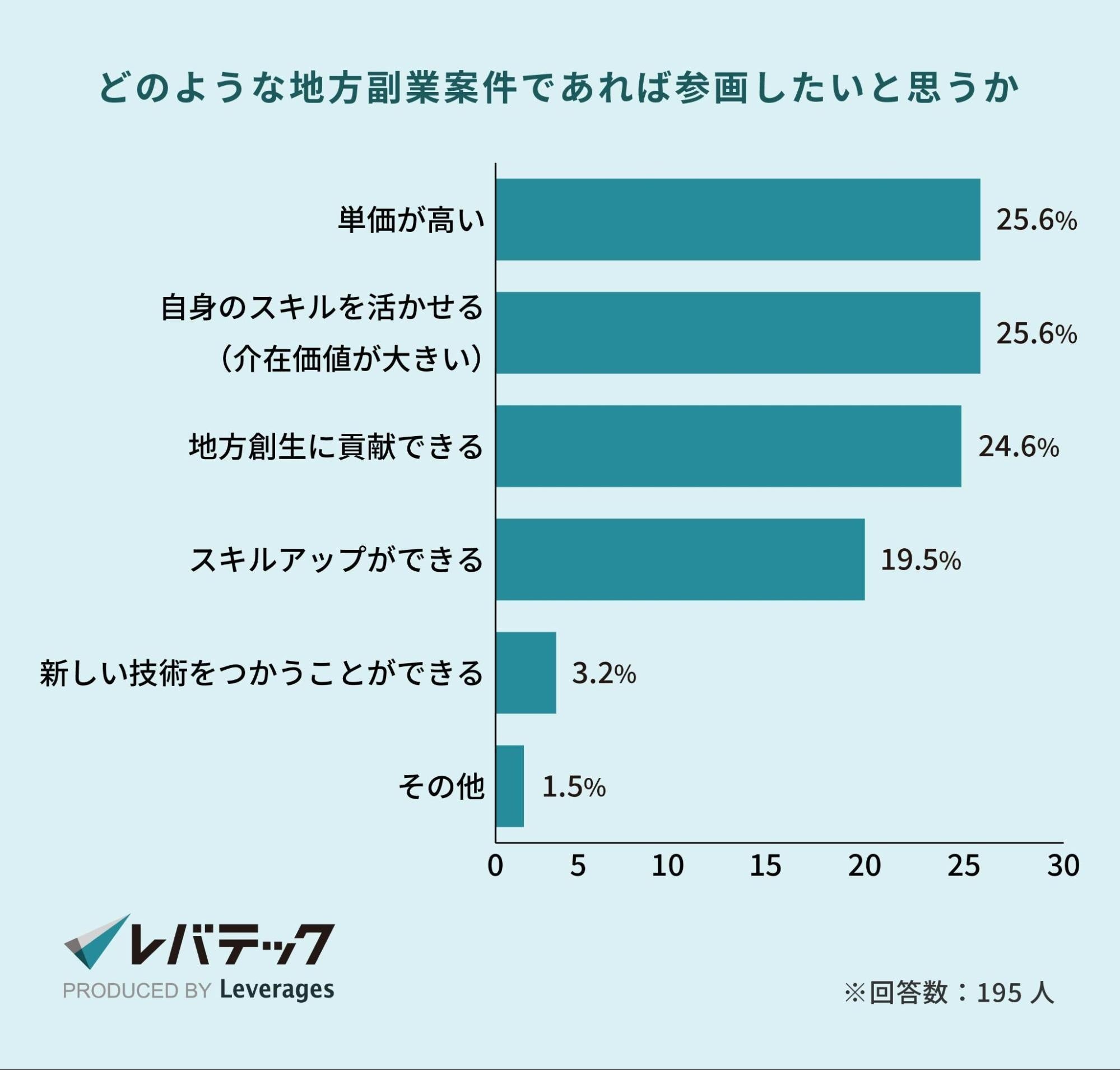 副業をしているが、地方で副業をしていないエンジニアに地方副業に興味があるか聞いたところ、約6割のエンジニアが「興味がある」と回答し、地方副業に興味があることがわかりました。また、どんな地方副業であれば参画したいかの質問では、約2割のエンジニアが「地方創生に貢献できること」と、回答しています。