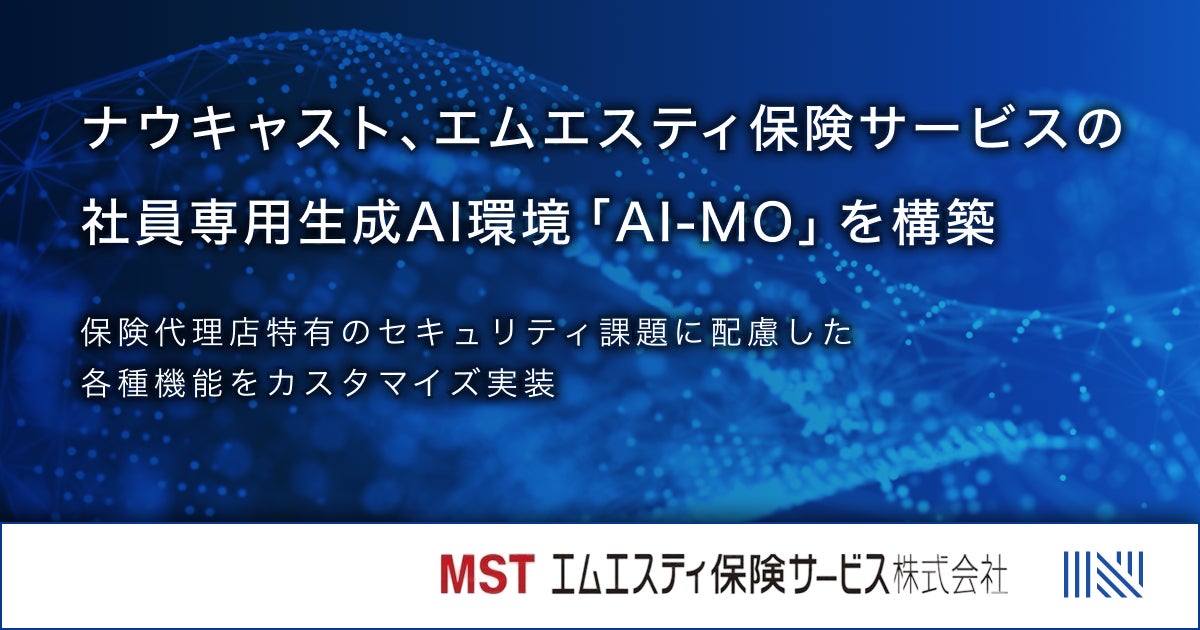 次世代金融インフラの提供を通して組込型金融を実現するFinatextグループの株式会社ナウキャスト(本社:東京都千代田区、代表取締役CEO:辻中 仁士、以下「ナウキャスト」)は、法人向け総合保険代理店のエムエスティ保険サービス株式会社(本社:東京都新宿区、代表取締役社長執行役員:佐々木 照之、以下「エムエスティ保険サービス」)の社員専用の生成AI環境「AI-MO(アイモ)」を構築しました。保険代理店に特有のセキュリティ課題に配慮した各種機能もカスタマイズして実装し、2025年5月からエムエスティ保険サービスの全社員約1,000名にご活用いただいています。