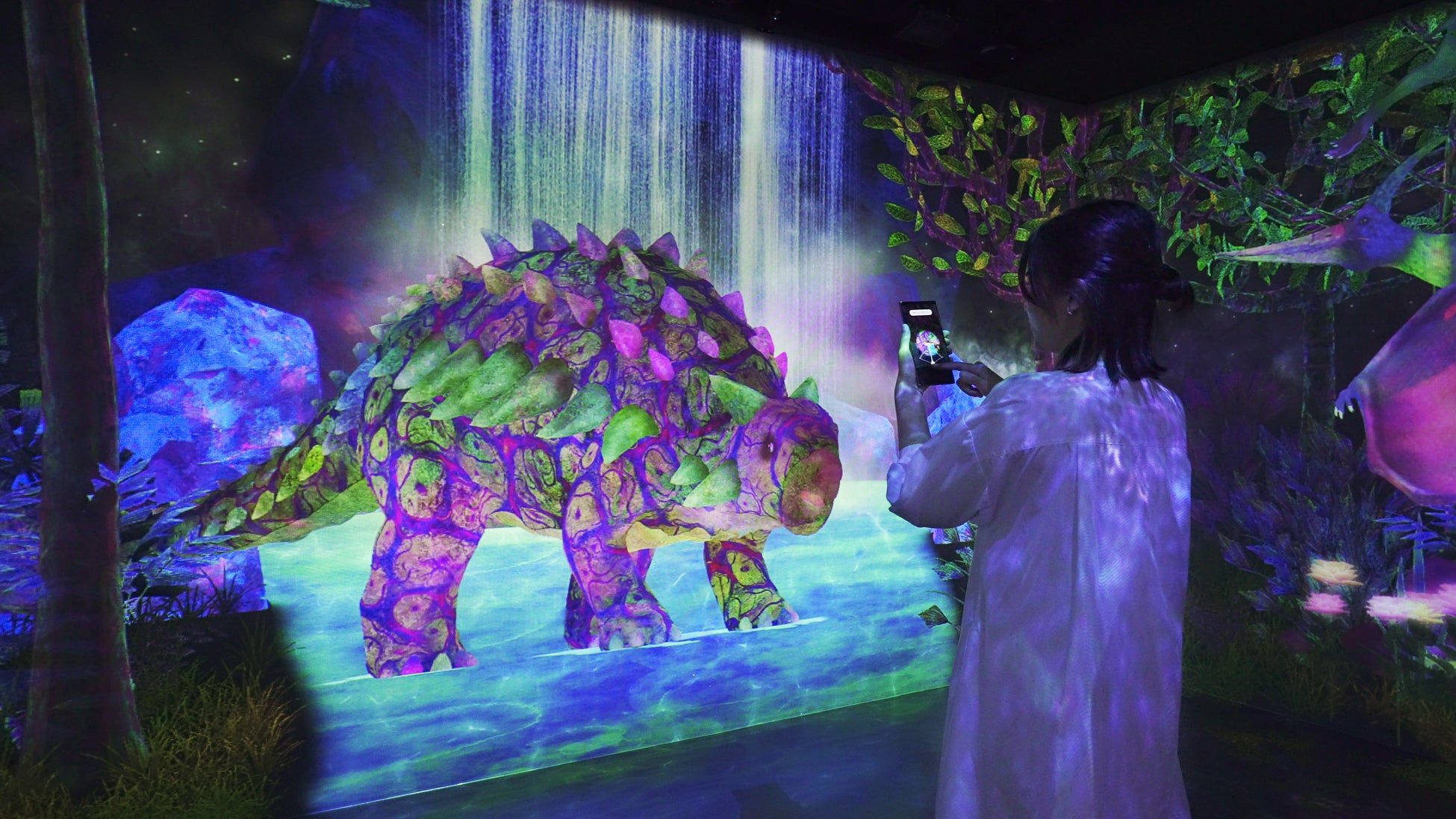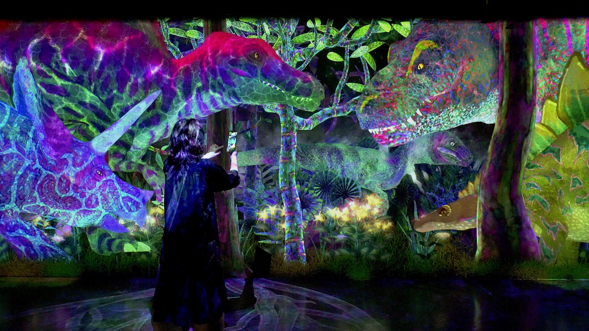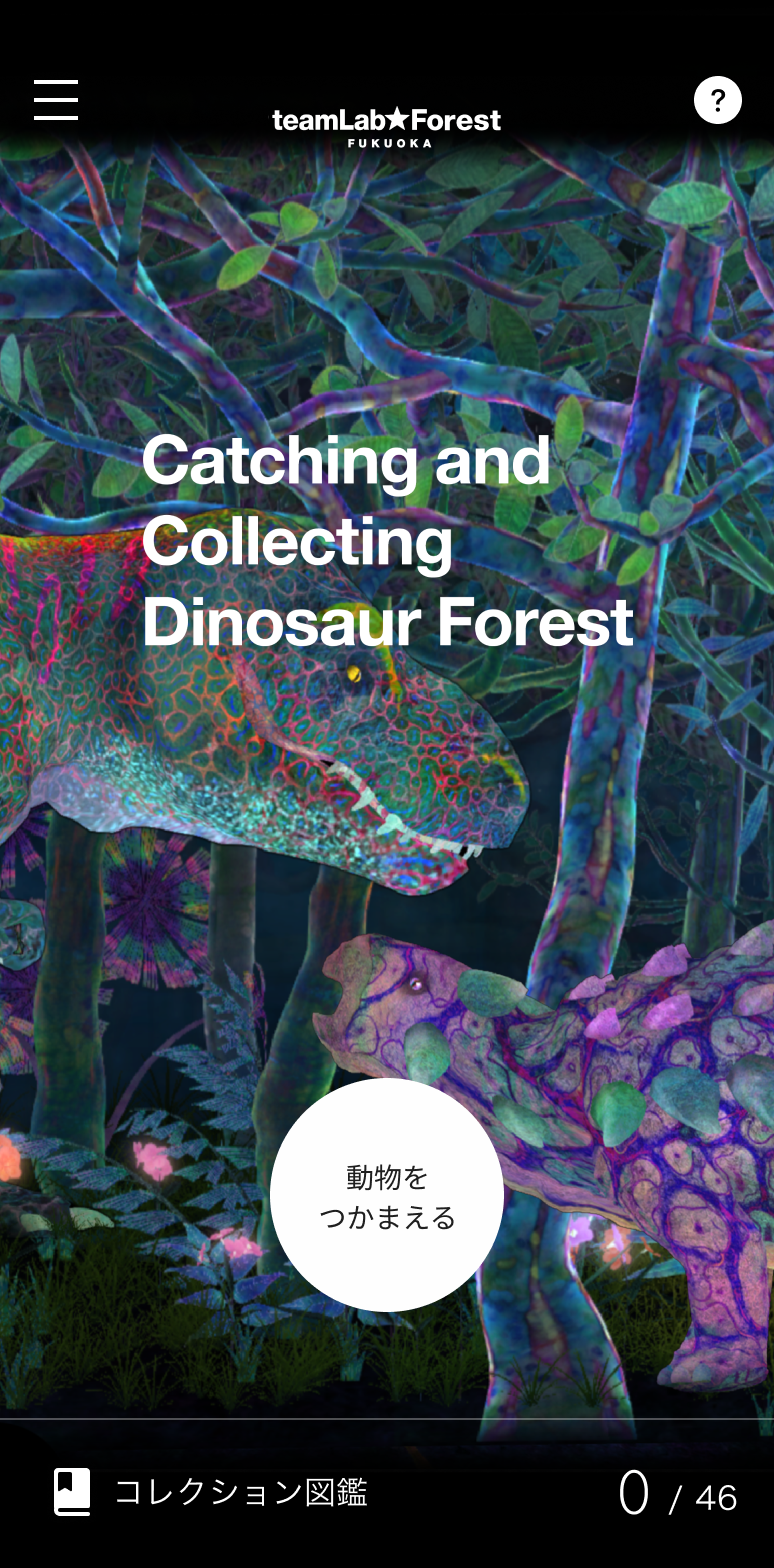 「つかまえて集める恐竜の森」は、自らの身体で探索し、発見し、捕 まえ、観察することで、知を集め、好奇心を広げていくことをコンセプトにした作品です。 恐竜の森には太古の動物たちが住んでいます。動物に近づいたり、触れたりすると、逃げたり、振り向いたりと反応します。さまざまな恐竜などの太古の動物を捕まえて観察し、自分だけのコレクション図鑑をつくっていきます。