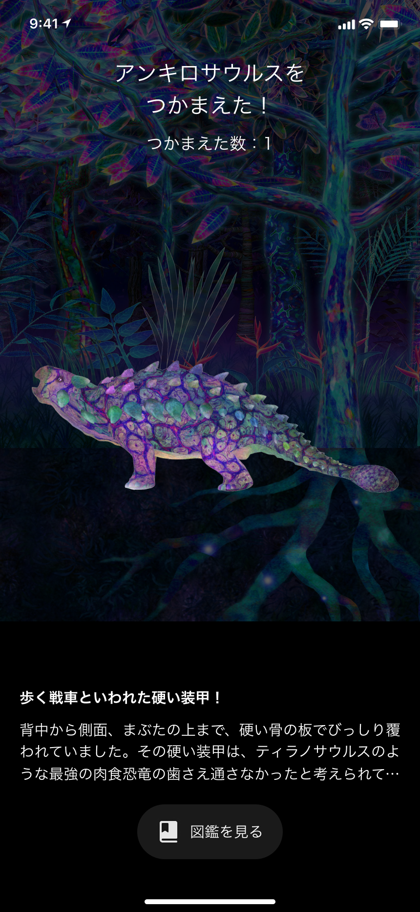 捕まえた恐竜は空間から消え、スマートフォン内の図鑑にコレクションされます。さまざまな恐竜を捕まえて観察し、自分だけのコレクション図鑑をつくっていきます。